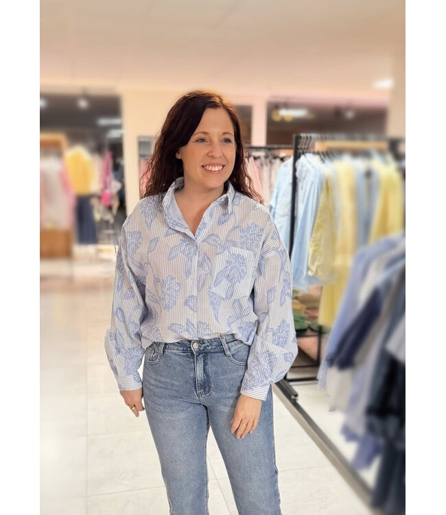 Blouse met lange mouw die d.m.v een knoopje tot een driekwart mouwtje kan gemaakt worden.