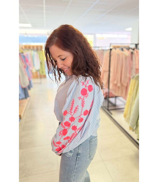 Blouse met wijde mouwen met geborduurde bloemen in fluoroze.