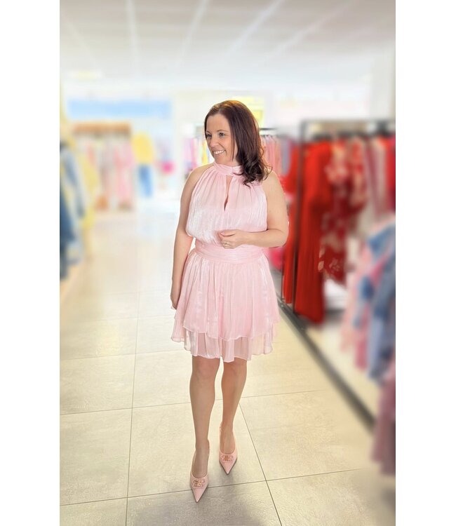 Kleedje in glanzende stof, achteraan met brede elastiek in de taille.