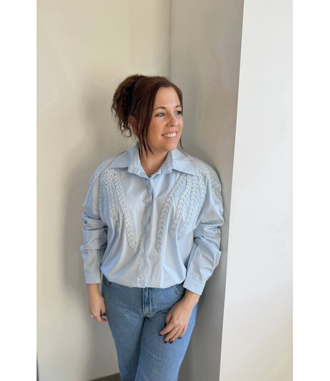 Hemdblouse afgewerkt met mooie opgeborduurde pareldetails.
