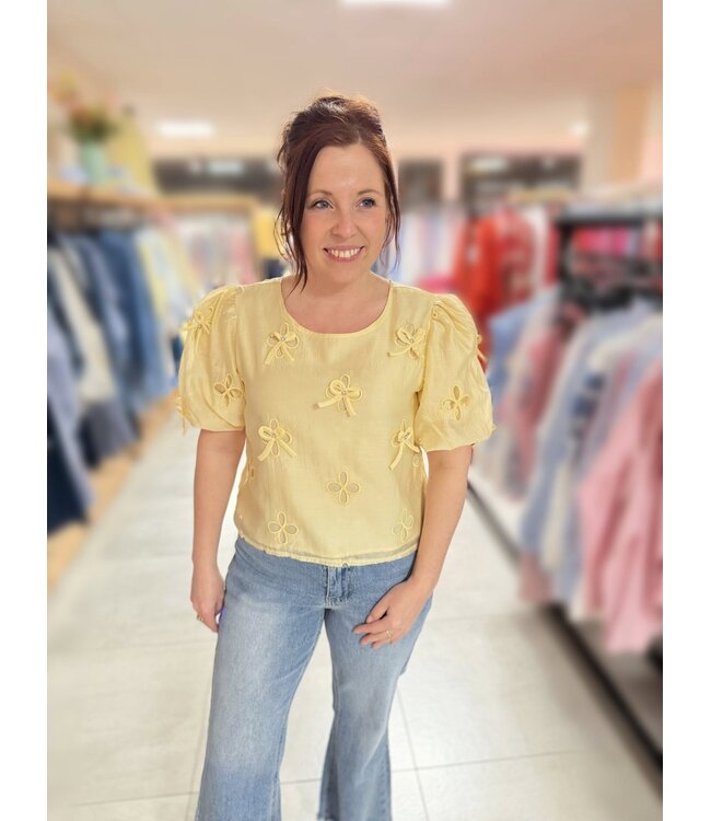 Top in lichtglanzende stof, afgewerkt met leuke strikjes en strass-steentjes.